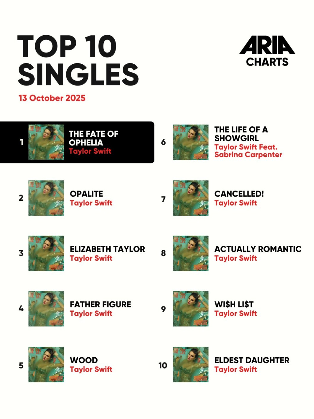 AUTOR•„The Life of a Showgirl” staje się pierwszym albumem w historii, który cały znalazł się w pierwszej dwunastce listy przebojów Australian Singles Chart (ARIA).