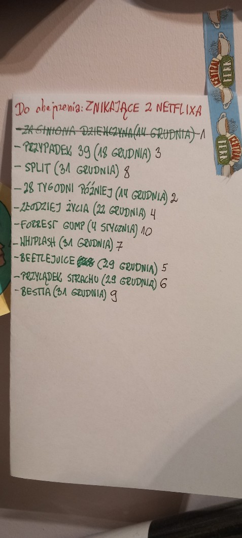 obejrzalam dzisiaj zaginioną dziewczynę, jeszcze mam w planach dwadzieścia osiem tygodni pozniej bo dzisiaj znikają z netflixa, to znikanie to jedyne co mnie motywuje. na dole wam podrzucam co jeszcze znika i kiedy (numerki obok to kolejność w jakiej będę oglądać)
