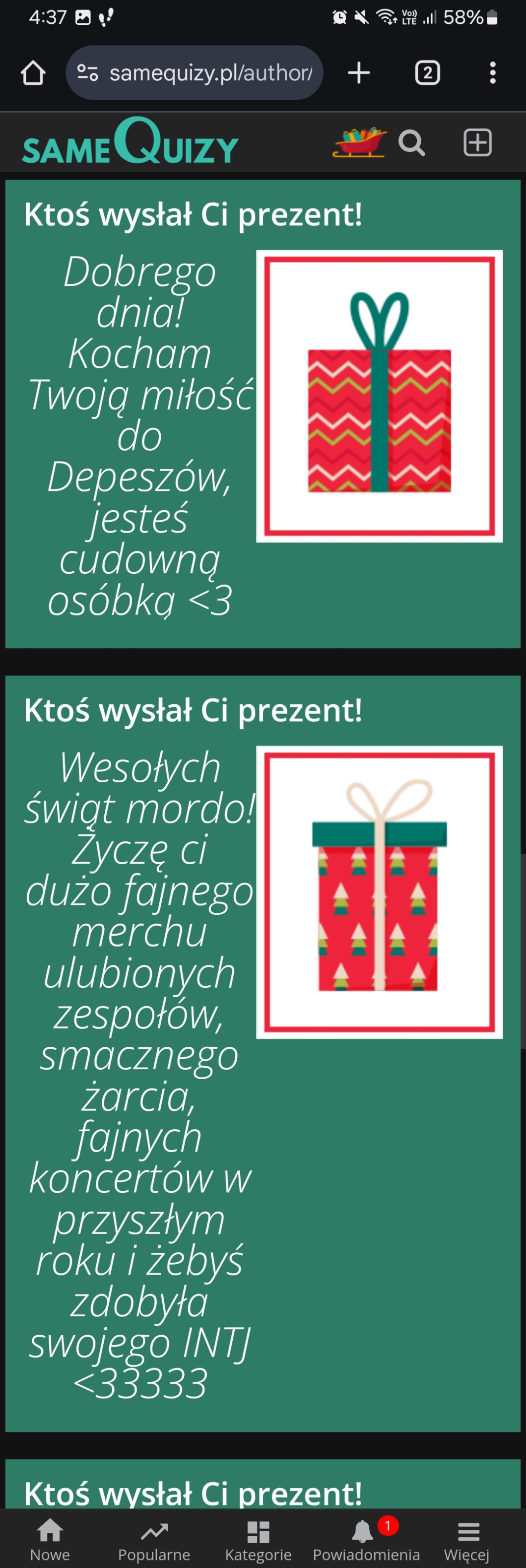 AUTOR•hejka!! mój ulubiony event, mianowicie prezenty <33 już trochę porozdawałam, niestety moja misja chwilowo się kończy bo idę do kościoła. Dzięki za te prezenty, naprawdę mega mega miło mi się zrobiło, aż wam wrzucę tu i pod wpisem <33