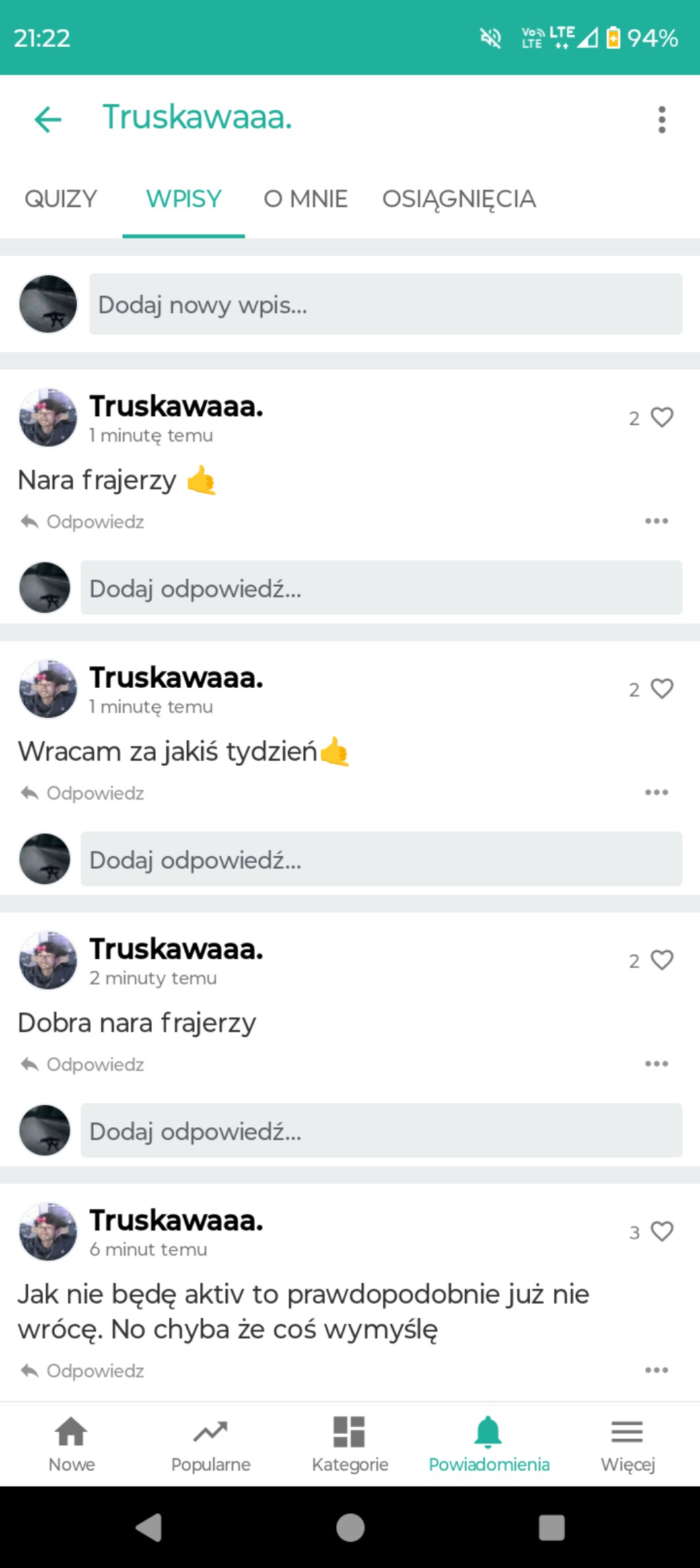 Przy pomocy wpisów możesz zadać autorowi pytanie, pochwalić go, poprosić o pomoc, a