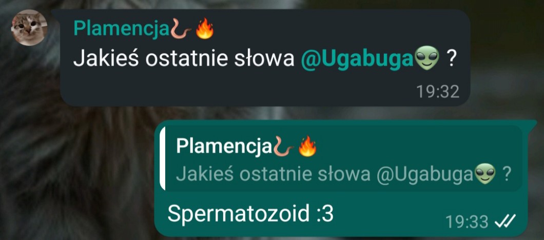 AUTOR•W skrócie powiedziałam jej że ma glizde przy nicku bo mi się jej nazwa kojarzy z plemnikiem (nie pytajcie xd) Więc nazwała mn czarnym żydem i spaliła w Otwocku a ja zaczęłam gadać po niemiecku (czm nie) teraz powstały o tym arty i memy