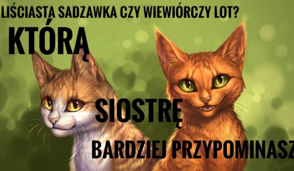 Witaj w tym quizie chciałabym Ci napisać którą z córek Ognistej Gwiazdy i Piaskowej Burzy przypominasz.Może Liściastą Sadzawkę:miłą i spokojną medyczkę Klanu Pioruna,albo odważna i energiczną kotke .