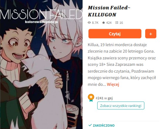 AUTOR•,,Właśnie oglądam jak Killua bije się z jakimś oblechem. Poznaliśmy się jakąś godzinę temu, a już czuje że się polubimy. Znaczy ja już go polubiłem… Jest taki miły i przystojny. Ma również bardzo przyjemny głos. Jego białe włosy są śliczne. Myślę, że ma jakieś 180cm wzrostu. Widać przez jego ciuchy, że jest dobrze zbudowany. Jednym słowem ideał." (Cytat z wpisu niżej)