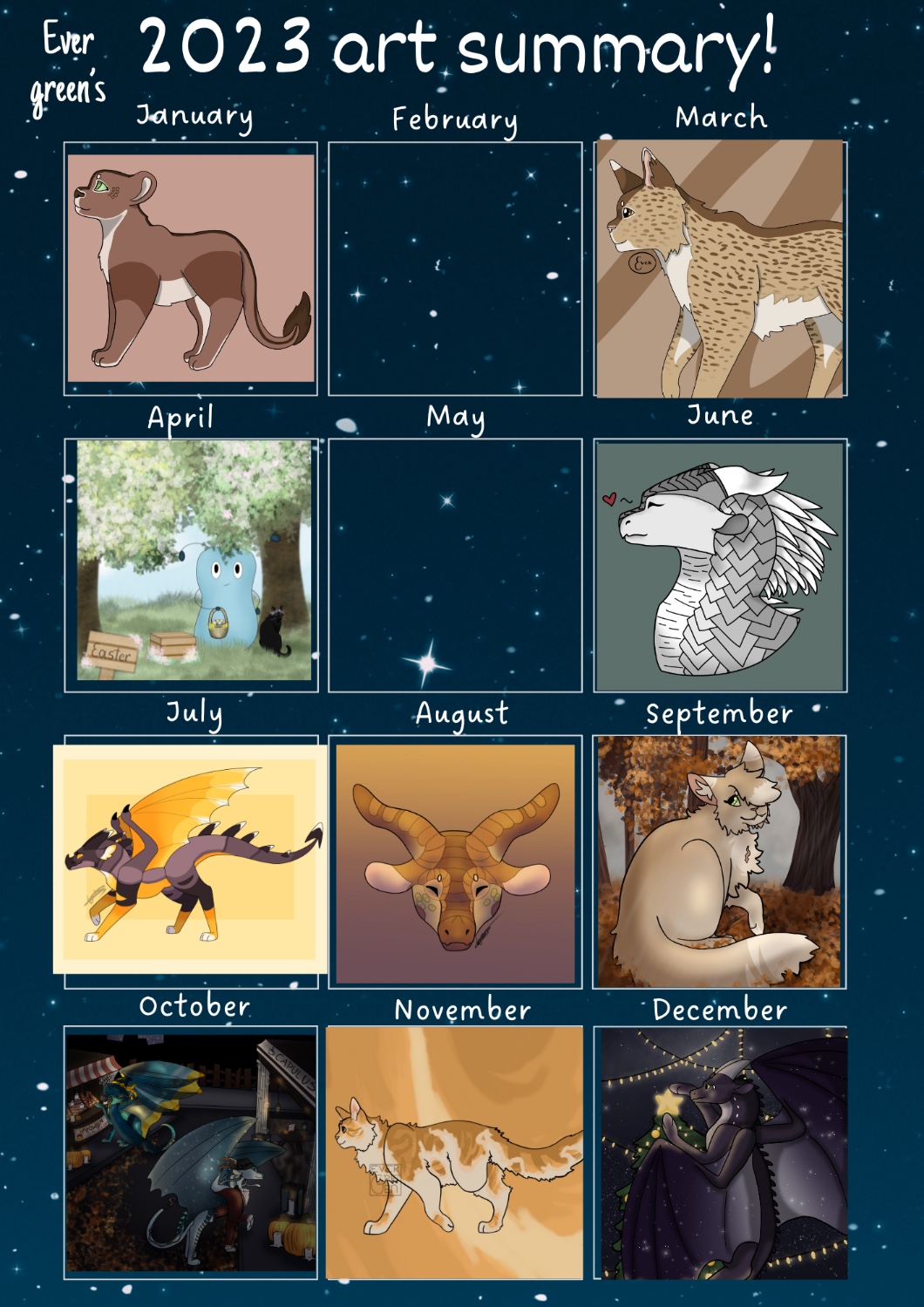 Jeśli chodzi o jakieś podsumowania, tooo zebrałam też jakiś rysunek z każdego miesiąca (na dole są). Muszę przyznać, że dużo lepiej teraz rysuję-
