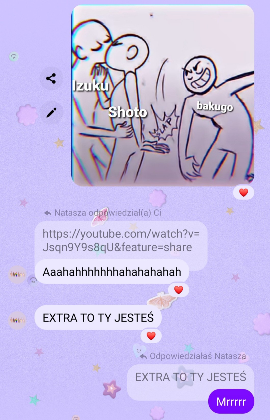 3.Byłam na podwórku, za mną łaził taki ziomek z mojej szkoły i darł cię "clam down anime dzieciaczki" więc walnęłam go "przypadkiem" huśtawką, a teraz spamię mu zdjęciami Runy i I Izuku💅🏼