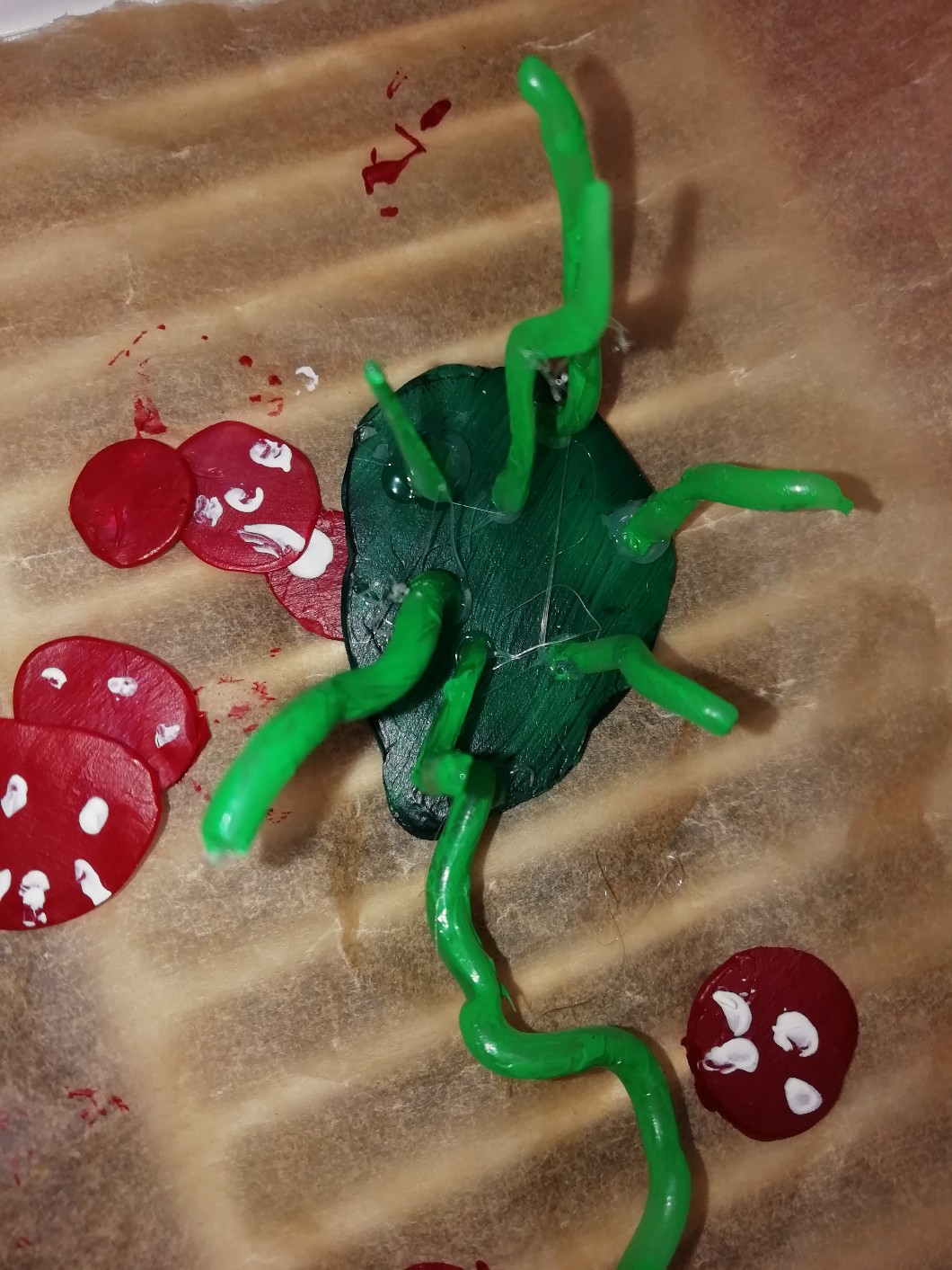 AUTOR•Właśnie chciałam doklejać kapelusze grzybkom no i ogarnęłam że te trzony( albo jakoś inaczej) są białe a ja je pomalowałam na zielono🤦♀️