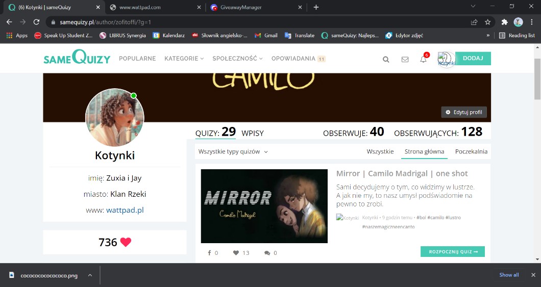 AUTOR•https://www.wattpad.com/story/302326021-mirror-camilo-madrigal Jest!!! Zrobiłam to!!! I bardzo bym prosiła o przeczytanie, nawet jak nie obejrzeliście Encanto, bo to nie nawiązuje jakoś bardzo oprócz postaci więc tego… I zastanawiam się czy kontynuować czy zostawić one shota. Chyba kontynuuję ale bardzo Was proszę o Wasze zdanie…