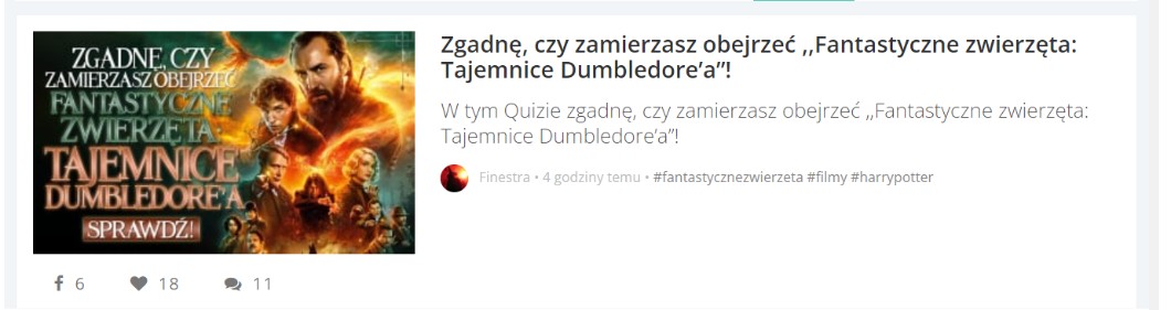 AUTOR•Quiz ,,Zgadnę czy zamierzasz obejrzeć ,,Fantastyczne zwierzęta: Tajemnice Dumbledore’a”! trafił dziś na Stronę Główną, jeju jak się cieszę! I jaką ma cudną miniaturkę!