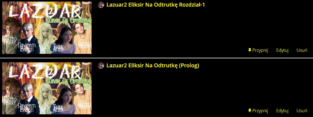• AUTOROd razu informuję, nowa okładka i nowy tytuł z Lazuar2 nie będzie opublikowane, wystarczy iż są dwa ,,Świetliki Kontra Trujący X" i ,,Stara Baśń" i zastanawiam się która z nich ma być przywrócona.
