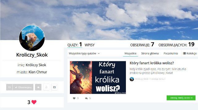 Wybaczcie, że dopiero teraz to wstawiam... Jeżeli zrobiłam błąd w czyjejś nazwie to piszcie! Kto przechodzi dalej?@Zosix_Sun_SQ Ma 52 obs@Wojownicy_konie Ma 52 obsCzy @Kroliczy_Skok przechodzi dalej?TakNie 15 Super! 303 Obserwuj autora Dodaj do ulubionych Następny quiz za: 10 AnulujRozwiąż teraz Jakie słodkie określenie do Ciebie pasuje? Quiz w Poczekalni. Zawiera nieodpowiednie treści? Wyślij zgłoszenie Zgłoś za plagiat Zgłoś za nieodpowiednie treści Wyślij