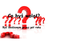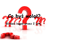 Co byś wolał?Być śledzonym przez pół rokuŚledzić kogoś przez 2 lata 0 Super! 42 Obserwuj autora Dodaj do ulubionych Następny quiz za: 10 AnulujRozwiąż teraz Kalkulator miłości – sprawdź szanse na miłość z wybraną osobą! Quiz w Poczekalni. Zawiera nieodpowiednie treści? Wyślij zgłoszenie Zgłoś za plagiat Zgłoś za nieodpowiednie treści Wyślij