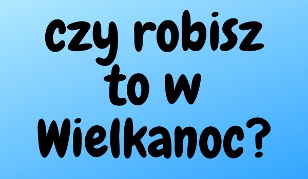 czy Święcisz jajka w Wielkanoc?taknieczy Robisz pisanki w Wielkanoc?taknieczy chodzisz do kościoła w Wielkanoc?tak ( jeśli mogę )nieczy co roku świętujesz Wielkanoc z rodziną?no taknieczy świętujesz i w niedzielę i poniedziałek Wielkanoc?taknie 5 Super! 217 Obserwuj autora Dodaj do ulubionych Następny quiz za: 10 AnulujRozwiąż teraz Czy kolor Twoich oczu pasuje do Twojej osobowości? Quiz w Poczekalni. Zawiera nieodpowiednie treści? Wyślij zgłoszenie Zgłoś za plagiat Zgłoś za nieodpowiednie treści Wyślij
