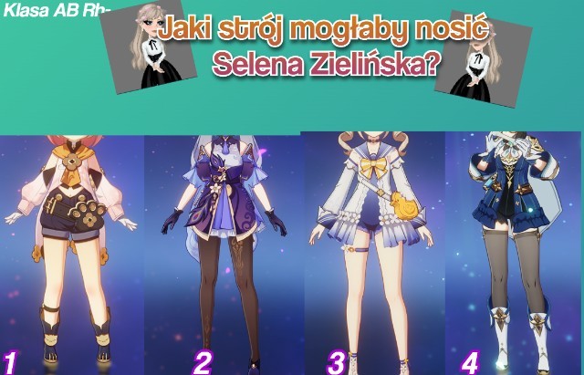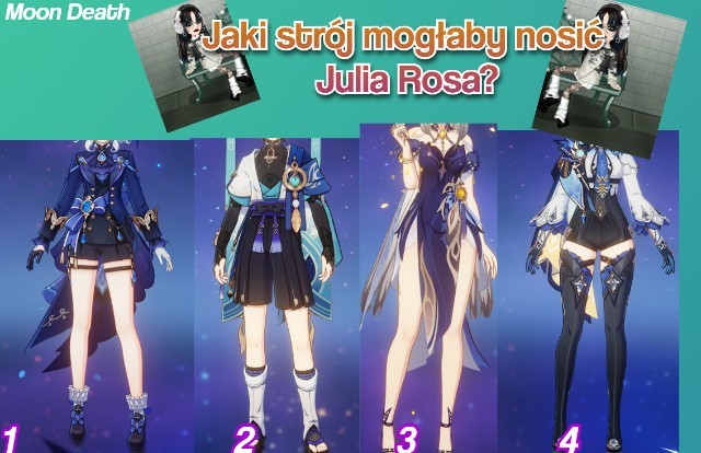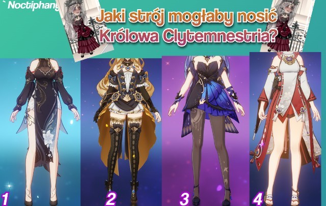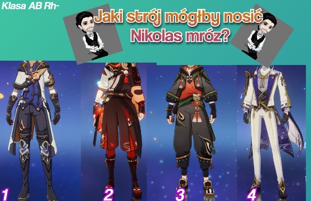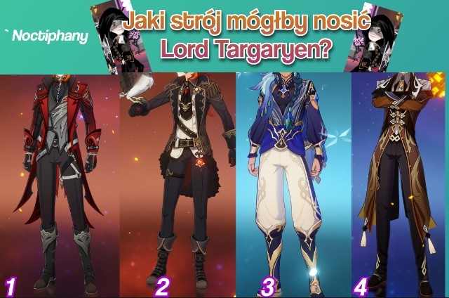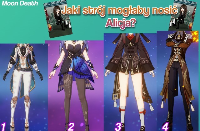 Witajcie, ten quiz polega na tym, że wstawiam tutaj zdjęcia kilka stroi, które noszą postacie z gry "Genshin impact". Losowo będę wybierać jakie dam albo spróbuję dopasować do postaci? no ale nie wiem na ile mi to wyjdzie, wybaczcie , a wy musicie dopasować, jaki strój mogłaby nosić postać z serii danej osoby. Miłej zabawy życzę!