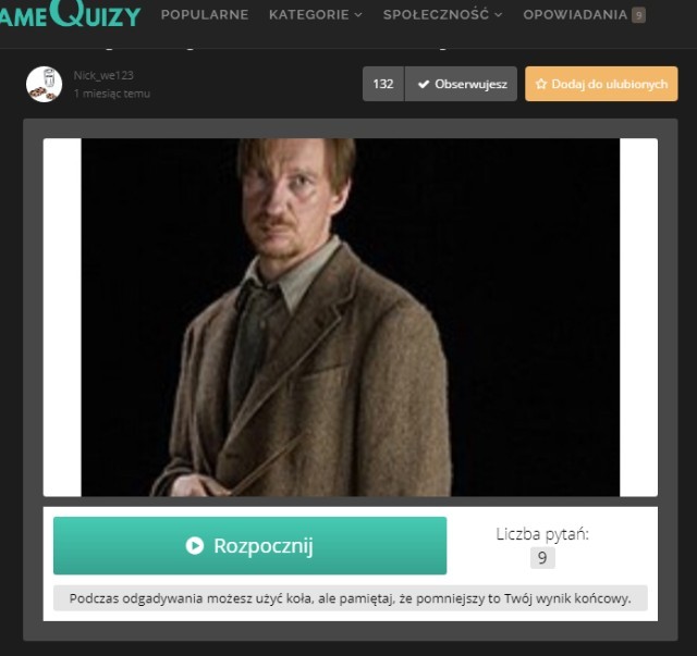 1 quiz @Nick_we123, czyli https://samequizy.pl/nazwij-ofiary-wilkolakow-litery/ ! Ocena: Miniaturka: Niestety jest tylko zdjęcie Remusa, więc nie oceniam Pomysłowość: Pomysł na quiz mi się bardzo podoba, wyczuwam starania - 10/10 Wykonanie: Fajny pomysł na takie zagadki. Osobiście bym zrobiła to bardziej profesjonalnie (np. jeden z rudzielców - jeden z Wesleyów) - 9/10 Błędy: Na końcu tych zagadek mogłyby być kropki lub 3 kropek ale poza tym mi się podoba - 9,5/10