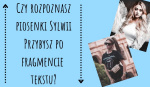 Czy rozpoznasz piosenki Sylwii Przybysz po fragmencie tekstu? belle.fleur • 5 lat temu •Przekonaj się czy uważnie wsłuchiwałeś się w piosenki Sysi! 3 4 Rozpocznij quiz