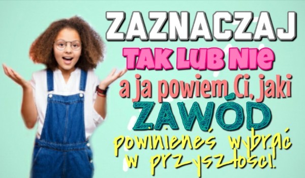 zaznacz tak lub nie a ja ci powiem jaki zawód powinieneś wybrać w przyszłości epecik_hihihi • 2 lata temu •Wejdź w quiz i zobacz jaki zawód powinieneś wykonywać w przeszłości. 6 0 Rozpocznij quiz
