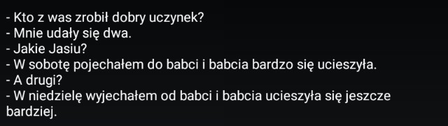 -Kto z was zrobił dobry uczynek? -Mnie udały się dwa. - Jakie Jasiu? -W sobotę pojechałem do babci i babcia bardzo się ucieszyła. -A drugi? -W niedzielę wyjechałem od babci i babcia ucieszyła się jeszcze bardziej.