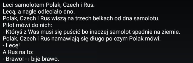 Leci samolotem Polak, Czech i Rus. Lecą, nagle odleciało dni. Polak, Czech i Rus wiszą na trzech belkach od dna samolotu. Pilot mówi do nich: -Któryś z Was musi się puścić bo inaczej samolot spadnie na ziemię. Polak, Czech i Rus namawiają się długo po czym Polak mówi : -Lecę! A Rus na to: -Brawo! - i bije brawo