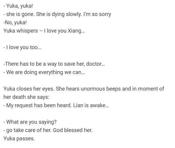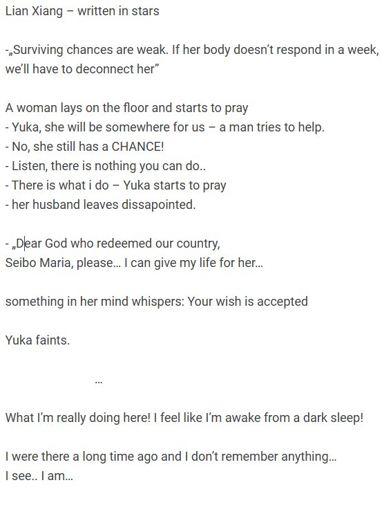 OK o mamo nie wiem dokładnie jak się stało że Lian została księżniczką (moze przekroczyła portal, otworzyła jakąs pradawną książkę i została przeniesiona w przeszłość) lub najbardziej mi bliskie; We śnie lub kiedy indziej przyszła do niej zmarła matka i prosiła by zmieniła historię Klanu. (to może być inaczej ale coś z I mperiami)